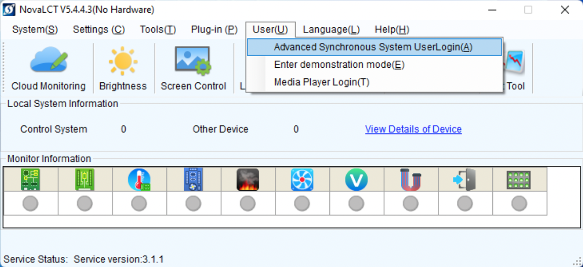 (www.novastar.tech/downloads > Software > NovaLCT) - Launch the software and navigate to Users > Advanced Synchronous System UserLogin