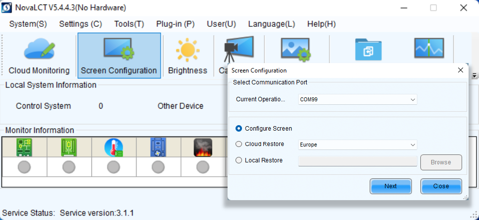- Click "Screen Configuration", then select the correct USB device from the "Current Operation" dropdown. (If using only one processor, it will be automatically selected)
