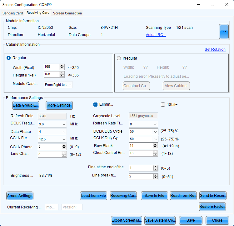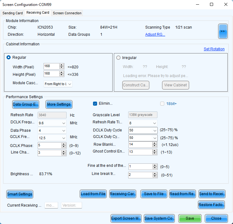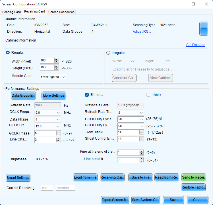 - Verify the information in the Cabinet Information section matches the configuration of the connected panels. After confirming this, click "Send to Receiving Card"